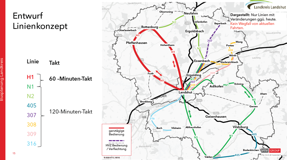 Das Buslinienkonzept beinhaltet auf der Hauptachse (Nordring) einen Stundentakt zwischen 06:00 Uhr und 20:00 Uhr, sowie einen zwei-Stunden-Takt ab 20:00 Uhr bis 22:00 Uhr. Die Nebenachse (Südring) wurde aus Kostengründen verschoben, soll nach Einführung aber im 2-Stunden-Takt, zwischen 06:00 Uhr und 20:00 Uhr, verkehren. Verflechtungen sollen mittels Einzelfahrten ermöglicht werden.Die Ausweitung der Fahrpläne erfolgt mit einem Start zum 01.01.2026. Dafür werden Im nördlichen und nordwestlichen Teil des Landkreises Landshut die Regionalbuslinien 533 (davor 303) und 534 (davor 304) verstärkt. Hierzu gibt es ab Januar 2026 einen extra Minifahrplan online abrufbar und auch in Print.Eine wichtige Neuerung ab dem neuen Jahr ist dabei die Verstärkung der künftigen Linie 537 (vor MVV-Beitritt: 307), also der Bestandslinie von Landshut Hauptbahnhof über die Gemeinden Essenbach und Weng bis Oberköllnbach, die auch die neue Haltestelle am Landratsamt in Essenbach bedient. Diese Linie, bedient von der Firma Petz, wird hervorragend angenommen, wird mit der Fahrplanänderung angepasst. Die Änderungen können auf der Fahrplanauskunft auf www.landkreis-landshut.de abgerufen werden.